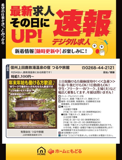 最新求人その日にUP!デジタル求人速報新着情報【随時更新中】お楽しみに!希望の仕事がきっとみつかる希望の仕事がきっとみつかる☎0268-44-2121担当/齋藤信州上田鹿教湯温泉の宿つるや旅館R254沿い、鹿教湯温泉にある旅館です!時給1,100円〜上田市年末年始働ける方歓迎♪も働け方歓♪Wワークで働きたい方ももちろん歓迎です土日祝働ける方大歓迎!時間帯相談OK!https://www.kakeyu-onsen.com/有限会社つるや旅館上田市鹿教湯温泉1374土日祝働ける方積極採用中!<<急募>>午前・午後だけもOK!1日勤務もOK!学生・フリーター・Wワーク、主婦(夫)など幅広く募集してます。年齢は問いません!パート・アルバイト1〜2名フロント、配膳・下膳スタッフ、清掃スタッフ雇用・労災保険、制服貸与、交通費規定支給食事補助、正社員登用制度あり●フロント※全曜日で募集[午後]14:00〜18:00(時間帯相談OK)●配膳・下膳スタッフ、清掃スタッフ※土日祝で募集[午前]8:30〜12:00(時間帯相談OK)[午後]16:00〜21:00(時間帯相談OK)※配膳・下膳スタッフは平日の早朝勤務も相談OKです。※その他、木曜日・金曜日で働ける方は積極採用します!★早朝勤務できる方は前日から泊ることもできます♪週1日勤務からOK!まずは「ココどう?を見ました」とお気軽にお電話ください。
