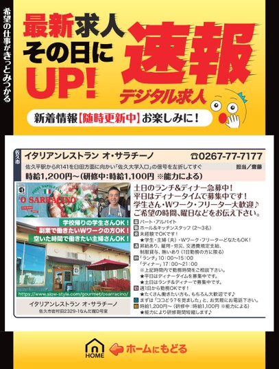 最新求人その日にUP!デジタル求人速報新着情報【随時更新中】お楽しみに!イタリアンレストランオ・サラチーノ佐久平駅からR141を臼田方面に向かい「佐久大学入口」の信号を左折してすぐ時給1,200円〜(研修中:時給1,100円※能力による)☎0267-77-7177担当/齋藤希望の仕事がきっとみつかる希望の仕事がきっとみつかる佐久市土日のランチ&ディナー急募中!平日はディナータイムで募集中です!学生さん・Wワーク・フリーター大歓迎♪ご希望の時間、曜日などをお伝え下さい。学校帰りの学生さんOK!副業で働きたいWワークの方OK!空いた時間で働きたい主婦さんOK!https://www.slow-style.com/gourmet/osarracino/イタリアンレストランオ・サラチーノ佐久市岩村田2329-1なんだ館D号室パート・アルバイトホール&キッチンスタッフ(2〜3名)未経験でOKです!★学生・主婦(夫)・Wワーク・フリーターどなたもOK!昇給あり、雇用・労災、交通費規定支給、制服貸与、賄いあり(1日勤務の方に限る)「ランチ」10:00〜15:00「ディナー」17:00〜21:00※上記時間内で勤務時間をご相談下さい。★平日はディナータイムを募集中です。★土日はランチ&ディナーで募集中です。週1日から勤務OKです!★たくさん働きたい方も、もちろん大歓迎です♪まずは「ココどう?を見ました」と、お気軽にお電話下さい。時給1,200円〜(研修中:時給1,100円※能力による)★能力により研修期間短縮します♪