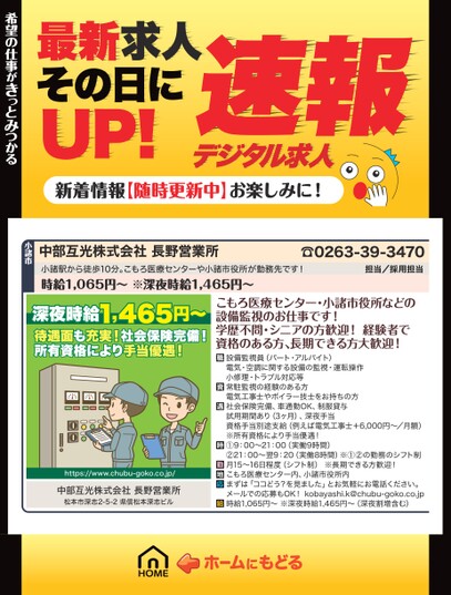 最新求人その日にUP!デジタル求人速報新着情報【随時更新中】お楽しみに!中部互光株式会社長野営業所小諸駅から徒歩10分。こもろ医療センターや小諸市役所が勤務先です!時給1,065円〜※深夜時給1,465円〜☎0263-39-3470担当/採用担当希望の仕事がきっとみつかる希望の仕事がきっとみつかる小諸市深夜時給1,465円〜待遇面も充実!社会保険完備!所有資格により手当優遇!https://www.chubu-goko.co.jp/中部互光株式会社長野営業所松本市深志2-5-2県信松本深志ビルこもろ医療センター・小諸市役所などの設備監視のお仕事です!学歴不問・シニアの方歓迎!経験者で資格のある方、長期できる方大歓迎!設備監視員(パート・アルバイト)電気・空調に関する設備の監視・運転操作小修理・トラブル対応等常駐監視の経験のある方電気工事士やボイラー技士をお持ちの方社会保険完備、車通勤OK、制服貸与試用期間あり(3ヶ月)、深夜手当資格手当別途支給(例えば電気工事士+6,000円〜/月額)※所有資格により手当優遇!①9:00〜21:00(実働9時間)②21:00〜翌9:20(実働8時間)※①②の勤務のシフト制月15〜16日程度(シフト制)※長期できる方歓迎!こもろ医療センター内、小諸市役所内まずは「ココどう?を見ました」とお気軽にお電話ください。メールでの応募もOK!kobayashi.k@chubu-goko.co.jp時給1,065円〜※深夜時給1,465円〜(深夜割増含む)