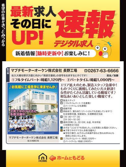 最新求人その日にUP!デジタル求人速報新着情報【随時更新中】お楽しみに!マブチモーターオーケン株式会社長野工場☎0267-63-6666佐久大橋を野沢方面に向かい「南部交番前」の信号を右折するとすぐです!①フルタイムパート:時給1,120円〜②パートタイム:時給1,090円〜担当/加藤希望の仕事がきっとみつかる希望の仕事がきっとみつかる佐久市♪お気軽に工場見学に来ませんか♪子育て中のママさん多数活躍中♪https://okenseiko.comマブチモーターオーケン株式会社長野工場佐久市原578エリア拡大のため、製造スタッフ急募中!ものづくりに挑戦してみたい方大歓迎!女性がたくさん活躍している職場です♪和気あいあいとした楽しい職場です。製造スタッフ①フルタイムパート(1名募集)②パートタイム(2名募集)経験不問昇給あり、賞与あり(パートさんでも支給しています!)社会保険完備、制服貸与、交通費規定支給①8:30〜17:30②9:00〜16:00週休2日制(土、日)GW、お盆、年末年始※年間休日116日まずは「ココどう?を見ました」とお気軽にお電話ください。★子育て中のママさん多数活躍中♪★学校行事や、お子さんの体調不良など急なお休みにも柔軟に対応いたします。①フルタイムパート:時給1,120円〜②パートタイム:時給1,090円〜