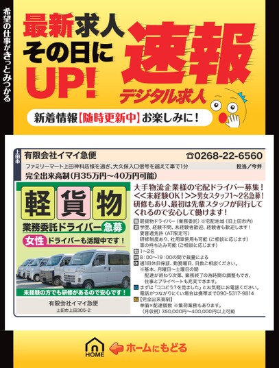 最新求人その日にUP!デジタル求人速報新着情報【随時更新中】お楽しみに!有限会社イマイ急便ファミリーマート上田神科店様を過ぎ、大久保入口信号を越えて車で1分完全出来高制(月35万円〜40万円可能)☎0268-22-6560担当/今井軽貨物業務委託ドライバー急募女性ドライバーも活躍中です!未経験の方でも研修があるので安心です!有限会社イマイ急便上田市上田305-2大手物流企業様の宅配ドライバー募集!<<未経験OK!>>男女スタッフ1〜2名急募!研修もあり、最初は先輩スタッフが同行してくれるので安心して働けます!軽貨物ドライバー(業務委託)※宅配地域(旧上田市内)学歴、経験不問、未経験者歓迎、経験者も歓迎します!要普通免許(AT限定可)研修制度あり、社用車使用も可能(ご相談に応じます)車の持ち込み可能(ご相談に応じます)1〜2名8:00〜19:00の間で裁量による週1日休日保証、勤務曜日、日数ご相談ください。※基本、月曜日〜土曜日の間配達が終わり次第、業務終了の為時間の調整もでき、仕事とプライベートも充実できます。まずは「ココどう?を見ました」とお気軽にお電話ください。電話がつながりにくい場合は携帯まで090-5317-9814【完全出来高制】単価×配達個数※集荷業務もあります。(月収例)350,000円〜400,000円以上可能希望の仕事がきっとみつかる希望の仕事がきっとみつかる上田市