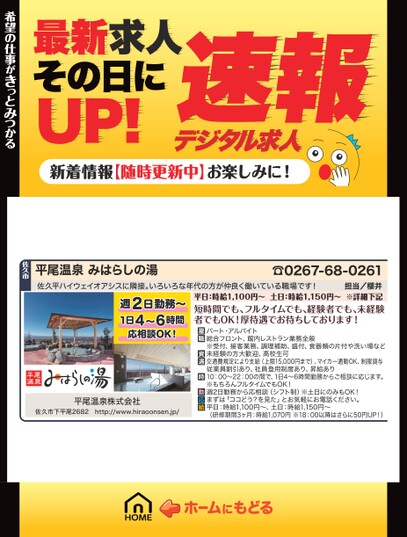 最新求人その日にUP!デジタル求人速報新着情報【随時更新中】お楽しみに!佐久平ハイウェイオアシスに隣接。いろいろな年代の方が仲良く働いている職場です!平尾温泉みはらしの湯日2週1日4応相談OK!勤務〜時間6〜平尾温泉株式会社佐久市下平尾2682http://www.hiraoonsen.jp/☎0267-68-0261担当/櫻井平日:時給1,100円〜土日:時給1,150円〜※詳細下記短時間でも、フルタイムでも、経験者でも、未経験者でもOK!厚待遇でお待ちしております!パート・アルバイト総合フロント、館内レストラン業務全般※受付、接客業務、調理補助、盛付、食器類の片付や洗い場など未経験の方大歓迎、高校生可交通費規定により支給(上限15,000円まで)、マイカー通勤OK、制服貸与従業員割引あり、社員登用制度あり、昇給あり10:00〜22:00の間で、1日4〜6時間勤務からご相談に応じます。※もちろんフルタイムでもOK!週2日勤務から応相談(シフト制)※土日にのみもOK!まずは「ココどう?を見た」とお気軽にお電話ください。平日:時給1,100円〜、土日:時給1,150円〜(研修期間3ヶ月:時給1,070円※18:00以降はさらに50円UP!)希望の仕事がきっとみつかる希望の仕事がきっとみつかる佐久市