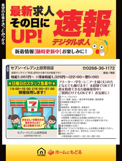 最新求人その日にUP!デジタル求人速報新着情報【随時更新中】お楽しみに!希望の仕事がきっとみつかる希望の仕事がきっとみつかる上田市セブン‐イレブン上田芳田店☎0268-36-1172担当/浅田浅間サンライン「芳田」信号から車で5分程度です!時給1,061円〜※深夜時給1,326円〜(22:00〜翌5:00)★日曜日のスタッフ急募中★①9:00〜15:00②15:00〜21:00積極採用します!学生さん!日曜日のみ働きませんか♪週1日勤務でOK!セブン‐イレブン上田芳田店上田市芳田1799-10フリーター・学生・シニア・主婦(夫)の方どなたでも働けます!未経験でOKです!週末勤務できる方積極採用中!ご質問だけでもOKです!お気軽に!パート・アルバイトレジ・接客・品出し・発注等予約業務、商品管理未経験者大歓迎です!3〜4名制服貸与、車通勤OK、昇給あり(A)6:00〜9:00(B)6:00〜12:00(C)15:00〜21:00(D)17:00〜21:00※上記時間帯を募集中です!※時間帯、ご質問などお気軽にお問合せ下さい♪★学生さんも大歓迎です!夕方からの勤務でOKです。★週末勤務できる方大歓迎♪週1日勤務からOK!まずは「ココどう?を見ました」とお気軽にお電話ください。Wワーク、主婦(夫)、学生など、どなたでもOK!時給1,061円〜※深夜時給1,326円〜(22:00〜翌5:00)