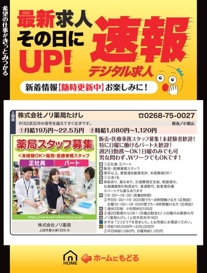 最新求人その日にUP!デジタル求人速報新着情報【随時更新中】お楽しみに!株式会社ノリ薬局たけし☎0268-75-0027担当/小宮山R152武石沖の信号を越えてすぐ左手です。①月給19万円〜22.5万円②時給1,080円〜1,120円薬局スタッフ募集<未経験OK>販売・医療事務スタッフ正社員パートhttps://www.nori-pharmacy.co.jp/株式会社ノリ薬局上田市蒼久保1525-6販売・医療事務スタッフ募集!未経験者歓迎!特に日曜に働けるパート大歓迎!週2日勤務〜OK!日曜のみでも可男女問わず、WワークでもOKです!①正社員②パート販売・医療事務スタッフ高卒以上、要普通自動車免許、未経験者OK!①②各1名昇給あり、賞与あり、交通費規定支給、制服貸与、社員購買割引制度あり、車通勤可、駐車場完備※パートでも賞与あります①9:00〜19:00(実働8時間)②平日9:00〜19:00の間で5〜8時間働ける方(応相談)日曜10:00〜19:00の間で5〜8時間働ける方(応相談)①週休2日制※年間休日105日②週2日勤務からOK!(日曜出勤含む)※日曜のみ勤務も可ノリ薬局たけし(上田市武石沖162)まずは「ココどう?を見ました」とお気軽にお電話ください。①月給190,000円〜225,000円②平日時給1,080円、日曜時給1,120円希望の仕事がきっとみつかる希望の仕事がきっとみつかる上田市