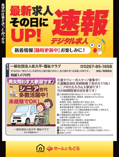 最新求人その日にUP!デジタル求人速報新着情報【随時更新中】お楽しみに!一般社団法人佐久平・福祉クラブR142沿い「沓沢入口」の信号を小諸方面に向かい、佐久橋の先「北岩尾」の角です。時給1,070円☎0267-85-1658担当/採用担当希望の仕事がきっとみつかる希望の仕事がきっとみつかる佐久市男女問わす大歓迎です♪シニア世代多数活躍中!未経験でOK!一般社団法人佐久平・福祉クラブ佐久市鳴瀬963-1介護タクシーのスタッフ募集中!介護職員初任者研修修了者の方でOK!シニアの方もちろん大歓迎です!1日4時間程度のお仕事です♪介護保険利用者の移送スタッフ(パート若干名)※介護保険利用者、障害者、病弱者の方々に対する移送運転業務です。★通院、転院、退院時に車で送迎します。★入社後は10日程度同行しながら指導いたします。★普通自動車第二種免許をお持ちでない方は入社後に移送サービス運転者講習会を受講して頂きます。(受講費用は、会社で負担します)介護職員初任者研修修了者(必須)年齢不問!未経験でOK!交通費規定支給、制服貸与、有給休暇あり7:00〜16:00の間で4時間程度※就業時間は相談の上決定します。週2〜3日勤務でOKです!※日曜日は定休日です。まずは「ココどう?を見ました」とお気軽にお電話ください。時給1,070円