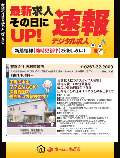 最新求人その日にUP!デジタル求人速報新着情報【随時更新中】お楽しみに!有限会社古越製麺所☎0267-32-2009担当/古越R18を小諸から御代田に向かい「平原東」信号を過ぎて左カーブの先の看板が目印!時給1,100円〜子育て中のママさんもOK!扶養範囲で働きたい方歓迎です!https://www.furukoshi.co.jp/有限会社古越製麺所御代田町馬瀬口877-5事業拡大につきスタッフ大募集!機械を使っての包装作業商品の賞味期限印字作業出荷先ごとの仕分け作業などのお仕事ですパート5名製造・検品・出荷作業スタッフ高卒以上、普通自動車免許(AT限定可)、未経験者大歓迎!昇給あり、各種社会保険、交通費規定支給、制服貸与マイカー通勤OK、有給休暇7:30〜17:30の間の働きたい時間帯でご応募ください。※ご相談に応じます。完全週休2日制※祝祭日は出勤(その他応相談)まずは「ココどう?を見ました」とお気軽にお電話ください。新しい工場の清潔な環境で汚れることもありません。年間を通して安定した室温で快適に仕事ができます!未経験者大歓迎!子育て中のママさんも活躍できる環境です!時給1,100円〜※経験者は優遇します!※研修期間中も時給1,100円〜(同条件)にて働けます。希望の仕事がきっとみつかる希望の仕事がきっとみつかる御代田町