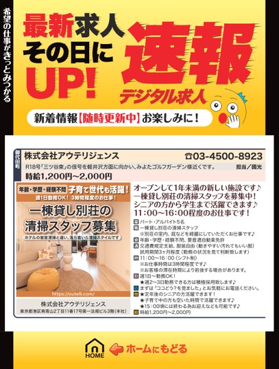 最新求人その日にUP!デジタル求人速報新着情報【随時更新中】お楽しみに!R18号「三ツ谷東」の信号を軽井沢方面に向かい、みよたゴルフガーデン様近くです。時給1,200円〜2,000円年齢・学歴・経験不問子育て世代も活躍!週1日勤務OK!3時間程度のお仕事!一棟貸し別荘の清掃スタッフ募集ホテルの客室清掃と違い、落ち着いた清掃スタイルですhttps://outelli.com/株式会社アウテリジェンス東京都港区南青山2丁目11番17号第一法規ビル3階(本社)オープンして1年未満の新しい施設です♪一棟貸し別荘の清掃スタッフを募集中!シニアの方から学生まで活躍できます♪11:00〜16:00程度のお仕事です!パート・アルバイト5名一棟貸し別荘の清掃スタッフ※別荘の室内、庭などを綺麗にしていただくお仕事です♪年齢・学歴・経験不問、要普通自動車免許交通費規定支給、服装自由(動きやすい汚れてもいい服)試用期間3ヶ月程度(勤務の状況を見て判断致します)11:00〜16:00(シフト制)※お仕事時間は3時間程度です♪※お客様の滞在時間により前後する場合があります。週1日〜勤務OK!★週2〜3日勤務できる方は積極採用致します♪まずは「ココどう?を見ました」とお気軽にお電話ください。★定年後のシニアの方活躍できます!★子育て中の方も空いた時間で活躍できます♪★15:00頃には終わる為お迎えなども可能です♪時給1,200円〜2,000円株式会社アウテリジェンス☎03-4500-8923担当/國光希望の仕事がきっとみつかる希望の仕事がきっとみつかる御代田町
