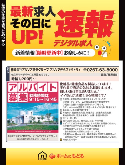 最新求人その日にUP!デジタル求人速報新着情報【随時更新中】お楽しみに!希望の仕事がきっとみつかる希望の仕事がきっとみつかる☎0267-63-8000担当/採用担当株式会社アルソア慧央グループアルソア佐久ファクトリィ佐久リサーチパーク工業団地内です。時給1,200円〜佐久市アルバイト募集勤務時間は9:15〜16:45https://www.arsoa-keio-group.co.jp/株式会社アルソア慧央グループアルソア佐久ファクトリィ佐久市瀬戸553-7佐久リサーチパーク化粧品・健康食品を製造しています!手作業で商品の包装をお願いします。難しいお仕事はありません♪ママさんが活躍できる職場です♪化粧品・健康食品の充填包装スタッフ(3〜5名)◎空調・クリーンルーム完備の清潔な作業環境です!◎高台に位置した眺望の素晴らしい工場です。◎アットホームな雰囲気と明るいスタッフが多い職場です♪高卒以上、未経験でOKです!昇給あり、社会保険完備、制服貸与、交通費規定支給有給休暇あり、育児休業あり、介護・看護休業あり9:15〜16:45週休2日制(土、日、祝)GW、お盆、年末年始まずは「ココどう?を見ました」とお気軽にお電話ください。◎子育て中のママさんが活躍できる職場です♪◎学校行事や、お子さんの体調不良など急なお休みにも柔軟に対応いたします。◎良質な水と豊かな大地、醸成発酵に不可欠な寒暖差など自然のエネルギーに満ちた環境で製品を製造しています。時給1,200円〜
