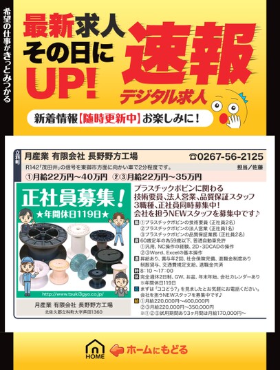 最新求人その日にUP!デジタル求人速報新着情報【随時更新中】お楽しみに!月産業有限会社長野野方工場R142「茂田井」の信号を東御市方面に向かい車で2分程度です。①月給22万円〜40万円②③月給22万円〜35万円☎0267-56-2125担当/佐藤正社員募集!★年間休日119日★プラスチックボビンに関わる技術要員、法人営業、品質保証スタッフ3職種、正社員同時募集中!会社を担うNEWスタッフを募集中です♪①プラスチックボビンの技術要員(正社員2名)②プラスチックボビンの法人営業(正社員1名)③プラスチックボビンの品質保証業務(正社員2名)60歳定年の為59歳以下、普通自動車免許①汎用、NC操作の経験、2D・3DCADの操作②③Word、Excelの基本操作昇給あり、賞与年2回、社会保険完備、退職金制度あり制服貸与、交通費規定支給、退職金共済8:10〜17:00完全週休2日制、GW、お盆、年末年始、会社カレンダーあり※年間休日119日まずは「ココどう?」を見ましたとお気軽にお電話ください。会社を担うNEWスタッフを募集中です♪①月給220,000円〜400,000円②③月給220,000円〜350,000円※①②③試用期間あり3ヶ月間は月給170,000円〜http://www.tsuki3gyo.co.jp/月産業有限会社長野野方工場北佐久郡立科町大字田1360希望の仕事がきっとみつかる希望の仕事がきっとみつかる立科町