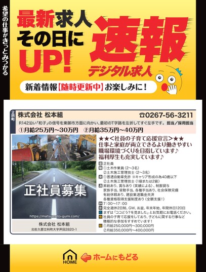 最新求人その日にUP!デジタル求人速報新着情報【随時更新中】お楽しみに!株式会社松本組☎0267-56-3211R142沿い「和子」の信号を東御市方面に向かい、最初のT字路を左折してすぐ左手です。担当/採用担当①月給25万円〜30万円②月給35万円〜40万円★★<社員の子育て応援宣言>★★仕事と家庭が両立できるより働きやすい職場環境づくりを目指しています♪福利厚生も充実しています♪正社員①土木作業員(2〜3名)②土木施工管理技士(2〜3名)①普通自動車免許※キャリア形成の為40歳以下②土木施工管理技士(1級または2級)昇給あり、賞与あり(実績による)、制服貸与家族手当、皆勤手当、各種手当あり、社会保険完備有給休暇あり、建設業退職金共済各種資格取得支援制度あり(全額支援!)7:00〜17:00完全週休2日制、GW、お盆、年末年始、年間休日120日まずは「ココどう?を見ました」とお気軽にお電話ください。社員の子育て応援をしており、子どもに関する行事など積極的な参加をすすめています!①月給250,000円〜300,000円②月給350,000円〜400,000円正社員募集https://matsumoto-gumi.com/株式会社松本組北佐久郡立科町大字田2820-1希望の仕事がきっとみつかる希望の仕事がきっとみつかる立科町