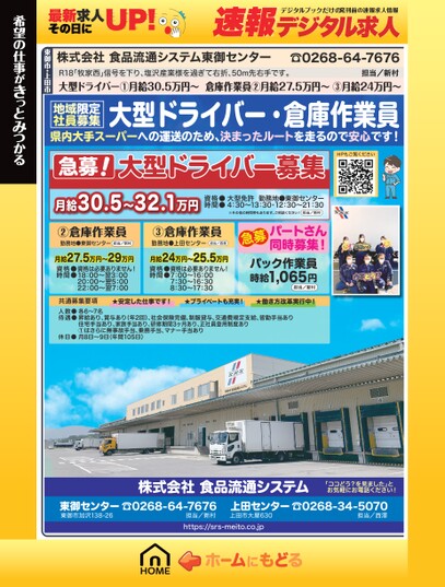 最新求人その日にUP!速報発刊前の速報求人情報デジタルブックだけのデジタル求人☎0268-64-7676株式会社食品流通システム東御センター担当/新村R18「牧家西」信号を下り、塩沢産業様を過ぎて右折、50m先右手です。大型ドライバー①月給30.5万円〜倉庫作業員②月給27.5万円〜③月給24万円〜地域限定社員募集県内大手スーパーへの運送のため、決まったルートを走るので安心です!大型ドライバー・倉庫作業員大型ドライバー募集HPもご覧ください急募!月給30.5〜32.1万円資格●時間●大型免許勤務地●東御センター4:30〜13:30・12:30〜21:30※その他の時間帯もあります。ご相談ください!担当/新村②倉庫作業員勤務地●東御センター担当/新村③倉庫作業員勤務地●上田センター担当/西澤月給27.5万円〜29万円資格●時間●資格は必要ありません!18:00〜翌3:0020:00〜翌5:0022:00〜翌7:00月給24万円〜25.5万円資格●時間●資格は必要ありません!7:00〜16:007:30〜16:308:30〜17:30パートさん同時募集!急募パック作業員時給円1,065担当/新村共通募集要項人数●待遇●★安定した仕事です!★プライベートも充実!★働き方改革実行中!各6〜7名昇給あり、賞与あり(年2回)、社会保険完備、制服貸与、交通費規定支給、皆勤手当あり住宅手当あり、家族手当あり、研修期間3ヶ月あり、正社員登用制度あり①はさらに無事故手当、乗務手当、マナー手当あり月8日〜9日(年間105日)休日●株式会社食品流通システム「ココどう?を見ました」とお気軽にお電話ください!東御センター東御市加沢138-26☎0268-64-7676上田センター☎0268-34-5070担当/西澤担当/新村https://srs-meito.co.jp上田市大屋630東御市・上田市希望の仕事がきっとみつかる