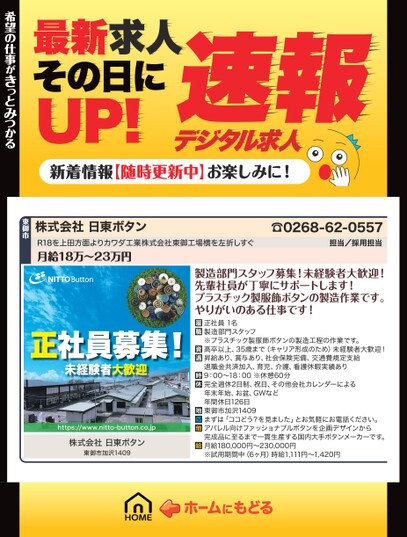 最新求人その日にUP!デジタル求人速報新着情報【随時更新中】お楽しみに!希望の仕事がきっとみつかる希望の仕事がきっとみつかる正社員募集!未経験者大歓迎https://www.nitto-button.co.jp株式会社日東ボタン東御市加沢1409製造部門スタッフ募集!未経験者大歓迎!先輩社員が丁寧にサポートします!プラスチック製服飾ボタンの製造作業です。やりがいのある仕事です!正社員1名製造部門スタッフ※プラスチック製服飾ボタンの製造工程の作業です。高卒以上、35歳まで(キャリア形成のため)未経験者大歓迎!昇給あり、賞与あり、社会保険完備、交通費規定支給退職金共済加入、育児、介護、看護休暇実績あり9:00〜18:00※休憩60分完全週休2日制、祝日、その他会社カレンダーによる年末年始、お盆、GWなど年間休日126日東御市加沢1409まずは「ココどう?を見ました」とお気軽にお電話ください。アパレル向けファッショナブルボタンを企画デザインから完成品に至るまで一貫生産する国内大手ボタンメーカーです。月給180,000円〜230,000円※試用期間中(6ヶ月)時給1,111円〜1,420円☎0268-62-0557担当/採用担当株式会社日東ボタンR18を上田方面よりカワダ工業株式会社東御工場横を左折しすぐ月給18万〜23万円東御市