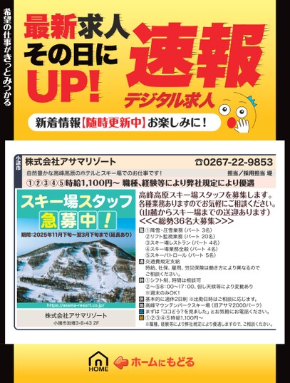 最新求人その日にUP!デジタル求人速報新着情報【随時更新中】お楽しみに!株式会社アサマリゾート☎0267-22-9853自然豊かな高峰高原のホテルとスキー場でのお仕事です!①②③④⑤時給1,100円〜職種、経験等により弊社規定により優遇担当/採用担当堤希望の仕事がきっとみつかる希望の仕事がきっとみつかる小諸市スキー場スタッフ急募中!期間:2025年11月下旬〜翌3月下旬まで(延長あり)https://asama-resort.co.jp/株式会社アサマリゾート小諸市加増3-8-432F高峰高原スキー場スタッフを募集します。各種業務ありますのでお気軽にご相談ください。(山麓からスキー場までの送迎あります)<<<総勢36名大募集>>>①降雪・圧雪業務(パート3名)②リフト監視業務(パート20名)③スキー場レストラン(パート4名)④スキー場業務全般(パート4名)⑤スキーパトロール(パート5名)交通費規定支給時給、社保、雇用、労災保険は働き方により異なるのでご相談ください。①シフト制、時間は相談可②〜⑤8:00〜17:00、但し天候等により変動あり※週末のみOK!基本的に週休2日制※出勤日時はご相談に応じます。高峰マウンテンパークスキー場(旧アサマ2000パーク)まずは「ココどう?を見ました」とお気軽にお電話ください。①②③④⑤時給1,100円〜※職種、経験等により弊社規定により優遇しますので、ご相談ください。