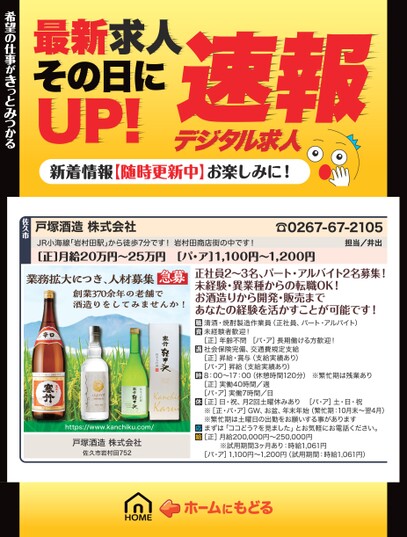 最新求人その日にUP!デジタル求人速報新着情報【随時更新中】お楽しみに!戸塚酒造株式会社JR小海線「岩村田駅」から徒歩7分です!岩村田商店街の中です![正]月給20万円〜25万円[パ・ア]1,100円〜1,200円☎0267-67-2105担当/井出希望の仕事がきっとみつかる希望の仕事がきっとみつかる佐久市業務拡大につき、人材募集急募創業370余年の老舗で酒造りをしてみませんか!正社員2〜3名、パート・アルバイト2名募集!未経験・異業種からの転職OK!お酒造りから開発・販売まであなたの経験を活かすことが可能です!清酒・焼酎製造作業員(正社員、パート・アルバイト)未経験者歓迎![正]年齢不問[パ・ア]長期働ける方歓迎!社会保険完備、交通費規定支給[正]昇給・賞与(支給実績あり)[パ・ア]昇給(支給実績あり)8:00〜17:00(休憩時間120分)※繁忙期は残業あり[正]実働40時間/週[パ・ア]実働7時間/日[正]日・祝、月2回土曜休みあり[パ・ア]土・日・祝※[正・パ・ア]GW、お盆、年末年始(繁忙期:10月末〜翌4月)※繁忙期は土曜日の出勤をお願いする事がありますまずは「ココどう?を見ました」とお気軽にお電話ください。[正]月給200,000円〜250,000円※試用期間3ヶ月あり:時給1,061円[パ・ア]1,100円〜1,200円(試用期間:時給1,061円)https://www.kanchiku.com/戸塚酒造株式会社佐久市岩村田752