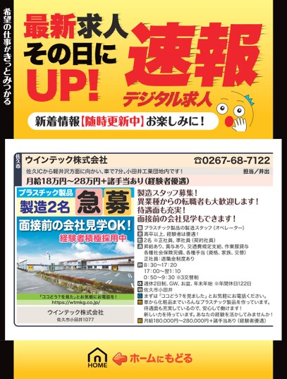 最新求人その日にUP!デジタル求人速報新着情報【随時更新中】お楽しみに!ウインテック株式会社佐久ICから軽井沢方面に向かい、車で7分。小田井工業団地内です!月給18万円〜28万円+諸手当あり(経験者優遇)☎0267-68-7122担当/井出希望の仕事がきっとみつかる希望の仕事がきっとみつかる佐久市プラスチック製品急募製造2名面接前の会社見学OK!経験者積極採用中「ココどう?を見た」とお気軽にお電話を!https://wtmkg.co.jp/ウインテック株式会社佐久市小田井1077製造スタッフ募集!異業種からの転職者も大歓迎します!待遇面も充実!面接前の会社見学もできます!プラスチック製品の製造スタッフ(オペレーター)高卒以上、経験者は優遇!2名※正社員、準社員(契約社員)昇給あり、賞与あり、交通費規定支給、作業服貸与各種社会保険完備、各種手当(資格、家族、交替)正社員:退職金制度あり8:30〜17:2017:00〜翌1:100:50〜9:30※3交替制週休2日制、GW、お盆、年末年始※年間休日122日佐久市小田井まずは「ココどう?を見ました」とお気軽にお電話ください。車から化粧品までいろんなプラスチック製品を作っています。待遇面も充実しているので、安心して働けます!新しい力を待っています。あなたの経験を活かしてみませんか!月給180,000円〜280,000円+諸手当あり(経験者優遇)
