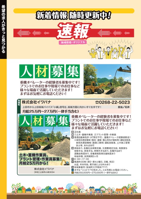 ☎0268-22-5023担当/石井重機オペレーターの経験者を募集中です!プラントでのお仕事や現場でのお仕事など様々な場面で活躍していただきます!まずはお気軽にお電話ください!正社員①土木・重機作業員②プラント管理・作業員普通自動車免許(AT限定不可)、重機オペレータ経験者歓迎!※車両系建設機械(整地・運搬・積込用及び掘削用)運転技能者、車両系建設機械(基礎工事用)運転技能者、土木施工管理技士等、あれば尚可昇給あり、各種社会保険完備、交通費規定支給、制服貸与皆勤手当、家族手当、時間外手当あり、各種手当あり退職金制度あり、各種資格取得支援制度あり有給休暇、試用期間3ヶ月8:00〜17:00隔週休2日制(第2・第4土曜日、日曜、祝日)お盆、年末年始、悪天候による休みあり坂城事業所(坂城町大字南条7717)まずは「ココどう?を見ました」とお気軽にお電話ください。月給250,000円〜270,000円(一律手当含む)土木・重機作業員、プラント管理・作業員募集!月給25万円から!株式会社イワバナ[本社]上田市小泉3034上田市から上田坂城バイパス「小綱」信号左、坂城方面に向かいすぐ右手です!月給25万円〜27万円(一律手当含む)株式会社イワバナ坂城町人材募集新着情報随時更新中!希望の求人がきっと見つかる人材募集重機オペレーターの経験者を募集中です!プラントでのお仕事や現場でのお仕事など様々な場面で活躍していただきます!まずはお気軽にお電話ください!