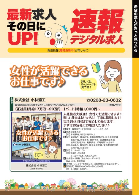希望の求人がきっと見つかるデジタル求人速報最新求人その日にUP!新着情報【随時更新中】お楽しみに!未経験者大歓迎!女性でも活躍できます♪難しい仕事はありません!丁寧に指導します!完全週休2日制で安心して働けます!まずはお気軽にお電話ください♪検査・事務スタッフ[正社員][パート]2〜3名普通自動車免許[正]未経験者大歓迎!高卒以上[正]昇給あり、賞与あり、退職金制度あり、社会保険完備家族手当、皆勤手当、技術手当、交通費規定支給残業代別途支給、制服貸与、試用期間3ヶ月あり[パ]昇給あり、賞与あり、社会保険完備、交通費規定支給技術手当、制服貸与[正]8:15〜17:00[パ]9:00〜15:00※フルタイムも、もちろんOK!完全週休2日制(会社カレンダーあり)GW、お盆、年末年始まずは「ココどう?を見ました」とお気軽にお電話ください。[正社員]月給170,000円〜200,000円[パート]時給1,000円〜女性が活躍できる性がお仕事です♪で♪詳しくはホームページも見てね!https://www.k-youkou.com/株式会社小林溶工上田市秋和959☎0268-23-0632担当/小林D'station上田店様すぐ近く。上田バイパス沿いにあります![正社員]月給17万円〜20万円[パート]時給1,000円〜株式会社小林溶工上田市女性が活躍できる女性が活躍できるお仕事です♪お仕事です♪詳しくはホームページも見てね!
