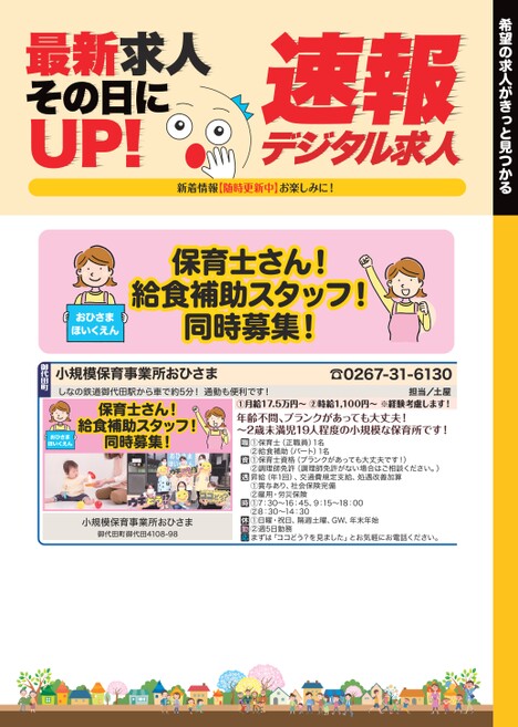 希望の求人がきっと見つかるデジタル求人速報新着情報【随時更新中】お楽しみに!最新求人その日にUP!☎0267-31-6130担当/土屋①月給17.5万円〜②時給1,100円〜※経験考慮します!年齢不問、ブランクがあっても大丈夫!〜2歳未満児19人程度の小規模な保育所です!①保育士(正職員)1名②給食補助(パート)1名①保育士資格(ブランクがあっても大丈夫です!)②調理師免許(調理師免許がない場合はご相談ください。)昇給(年1回)、交通費規定支給、処遇改善加算①賞与あり、社会保険完備②雇用・労災保険①7:30〜16:45、9:15〜18:00②8:30〜14:30①日曜・祝日、隔週土曜、GW、年末年始②週5日勤務まずは「ココどう?を見ました」とお気軽にお電話ください。しなの鉄道御代田駅から車で約5分!通勤も便利です!小規模保育事業所おひさま御代田町保育士さん!給食補助スタッフ!同時募集!おひさまほいくえん小規模保育事業所おひさま御代田町御代田4108-98保育士さん!給食補助スタッフ!同時募集!おひさまほいくえん