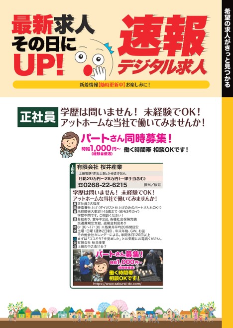 希望の求人がきっと見つかるデジタル求人速報最新求人その日にUP!新着情報【随時更新中】お楽しみに!正社員学歴は問いません!未経験でOK!アットホームな当社で働いてみませんか!パートさん同時募集!時給円〜1,000(経験者優遇)働く時間帯相談OKです!上田電鉄「赤坂上駅」から徒歩5分。月給20万円〜28万円(一律手当含む)☎0268-22-6215担当/桜井学歴は問いません!未経験でOK!アットホームな当社で働いてみませんか!正社員2名程度鋳造兼仕上げ(ダイガスト仕上げのみのパートさんもOK!)未経験者大歓迎!45歳まで(省令3号のイ)学歴不問です。ご相談ください!昇給あり、賞与年2回、各種社会保険完備交通費規定支給、退職金制度あり8:30〜17:30※残業月平均20時間目安土曜・日曜(週休2日制)、年末年始、GW、お盆その他会社カレンダーによる。年間休日120日以上まずは「ココどう?を見ました」とお気軽にお電話ください。有限会社桜井産業上田市中之条116-7有限会社桜井産業上田市パートさん募集!(経験者優遇)時給円〜1,000働く時間帯相談OKです!https://www.sakurai-dc.com/