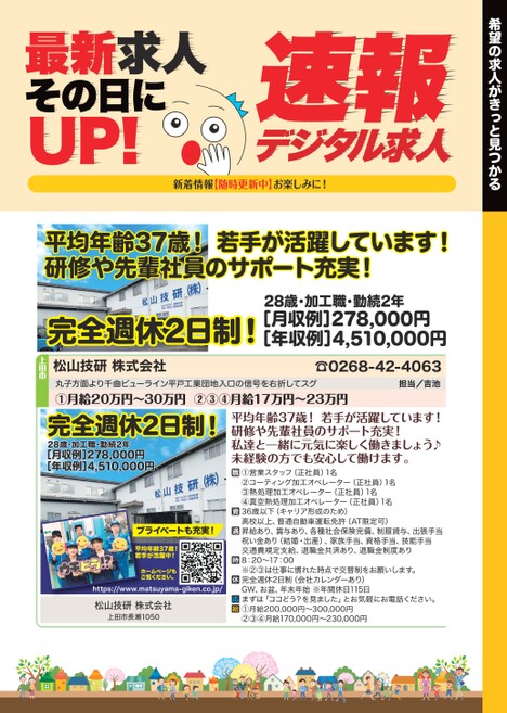 希望の求人がきっと見つかるデジタル求人速報最新求人その日にUP!新着情報【随時更新中】お楽しみに!平均年齢37歳!若手が活躍しています!研修や先輩社員のサポート充実!28歳・加工職・勤続2年完全週休2日制![月収例]278,000円[年収例]4,510,000円☎0268-42-4063松山技研株式会社上田市丸子方面より千曲ビューライン平戸工業団地入口の信号を右折してスグ①月給20万円〜30万円②③④月給17万円〜23万円担当/吉池完全週休2日制!28歳・加工職・勤続2年[月収例]278,000円[年収例]4,510,000円プライベートも充実!平均年齢37歳!若手が活躍中!ホームページもご覧ください。https://www.matsuyama-giken.co.jp/松山技研株式会社上田市長瀬1050平均年齢37歳!若手が活躍しています!研修や先輩社員のサポート充実!私達と一緒に元気に楽しく働きましょう♪未経験の方でも安心して働けます。①営業スタッフ(正社員)1名②コーティング加工オペレーター(正社員)1名③熱処理加工オペレーター(正社員)1名④真空熱処理加工オペレーター(正社員)1名36歳以下(キャリア形成のため)高校以上、普通自動車運転免許(AT限定可)昇給あり、賞与あり、各種社会保険完備、制服貸与、出張手当祝い金あり(結婚・出産)、家族手当、資格手当、技能手当交通費規定支給、退職金共済あり、退職金制度あり8:20〜17:00※②③は仕事に慣れた時点で交替制をお願いします。完全週休2日制(会社カレンダーあり)GW、お盆、年末年始※年間休日115日まずは「ココどう?を見ました」とお気軽にお電話ください。①月給200,000円〜300,000円②③④月給170,000円〜230,000円