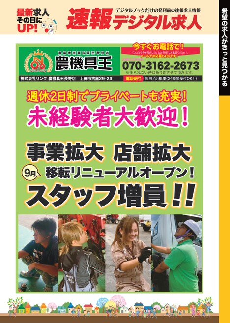 希望の求人がきっと見つかる最新求人その日にUP!速報発刊前の速報求人情報デジタルブックだけのデジタル求人今すぐお電話で!株式会社リンク農機具王長野店上田市古里29-23「ココどう?を見ました」とお気軽にお電話ください。メールでの応募もOKです!応募はお気軽に070-3162-2673※出られない時は折り返させて頂きます。電話受付担当/小相澤(24時間受付OK!)週休2日制でプライベートも充実!未経験者大歓迎!事業拡大店舗拡大スタッフ増員!!移転リニューアルオープン!9月