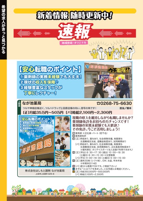 ☎0268-75-6630担当/橋本ツルヤ神畑店様近く、ツルハドラッグ上田原店様の向い、信号の角です![正]月給35万円〜50万円[パ]時給2,100円〜2,300円なが池薬局上田市【安心転職のポイント】収入を保障①薬剤師の実務未経験でも大丈夫!②現状の♪③経験豊富なスタッフが丁寧にレクチャー!株式会社はしもと調剤なが池薬局上田市上田原1329-8現職の収入を維持しながら転職しませんか?薬剤師免許をお持ちの方チャンスです!薬剤師の実務未経験でも大歓迎♪その免許、今こそ活用しましょう!薬剤師※正社員・パート(若干名)薬剤師免許[正]昇給あり、賞与あり、社会保険完備、制服貸与交通費規定支給、退職金制度あり、試用期間あり[パ]昇給あり、賞与あり、社会保険完備、制服貸与交通費規定支給、試用期間あり、正社員登用制度あり※福利厚生:ホリデイスポーツ法人会員で利用できます♪[正]早出)8:30〜17:30(遅出)10:00〜18:30(土曜日)8:30〜15:00※交替勤務[パ]平日)9:00〜18:00(土曜日)9:00〜15:00[正]週休2日制(シフト制)、GW、お盆、年末年始※年間休日114日[パ]週1から勤務でOKです。ご相談下さい♪まずは「ココどう?を見ました」とお気軽にお電話ください。[正]月給350,000円〜500,000円[パ]時給2,100円〜2,300円新着情報随時更新中!希望の求人がきっと見つかる【安心転職のポイント】収入を保障①薬剤師の実務未経験でも大丈夫!②現状の♪③経験豊富なスタッフが丁寧にレクチャー!
