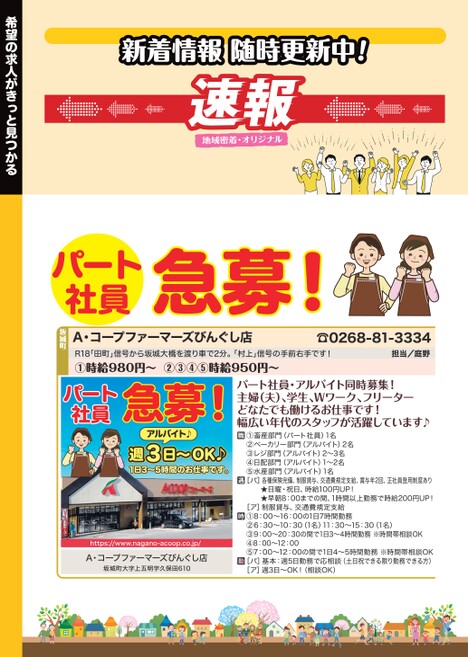 ☎0268-81-3334担当/庭野パート社員・アルバイト同時募集!主婦(夫)、学生、Wワーク、フリーターどなたでも働けるお仕事です!幅広い年代のスタッフが活躍しています♪①畜産部門(パート社員)1名②ベーカリー部門(アルバイト)2名③レジ部門(アルバイト)2〜3名④日配部門(アルバイト)1〜2名⑤水産部門(アルバイト)1名[パ]各種保険完備、制服貸与、交通費規定支給、賞与年2回、正社員登用制度あり★日曜・祝日、時給100円UP!★早朝8:00までの間、1時間以上勤務で時給200円UP![ア]制服貸与、交通費規定支給①8:00〜16:00の1日7時間勤務②6:30〜10:30(1名)11:30〜15:30(1名)③9:00〜20:30の間で1日3〜4時間勤務※時間帯相談OK④8:00〜12:00⑤7:00〜12:00の間で1日4〜5時間勤務※時間帯相談OK[パ]基本:週5日勤務で応相談(土日祝できる限り勤務できる方)[ア]週3日〜OK!(相談OK)https://www.nagano-acoop.co.jp/A・コープファーマーズびんぐし店坂城町大字上五明字久保田610パートパート社員社員急募!A・コープファーマーズびんぐし店坂城町R18「田町」信号から坂城大橋を渡り車で2分。「村上」信号の手前右手です!①時給980円〜②③④⑤時給950円〜パート社員急募!アルバイト♪週3日〜OK♪1日3〜5時間のお仕事です。新着情報随時更新中!希望の求人がきっと見つかる