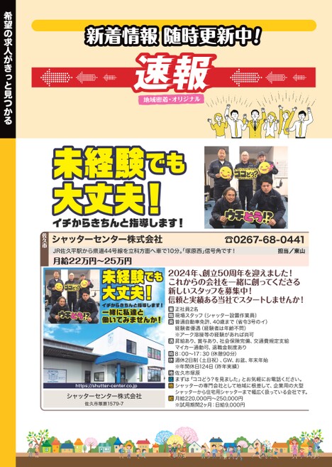 新着情報随時更新中!未経験でも大丈夫!イチからきちんと指導します!シャッターセンター株式会社☎0267-68-0441担当/東山JR佐久平駅から県道44号線を立科方面へ車で10分。塚原西」信号角です!月給22万円〜25万円未経験でも大丈夫!イチからきちんと指導します!一緒に私達と働いてみませんか!https://shutter-center.co.jpシャッターセンター株式会社佐久市塚原1579-72024年、創立50周年を迎えました!これからの会社を一緒に創ってくださる新しいスタッフを募集中!信頼と実績ある当社でスタートしませんか!正社員2名現場スタッフ(シャッター設置作業員)普通自動車免許、40歳まで(省令3号のイ)経験者優遇(経験者は年齢不問)※アーク溶接等の経験があれば尚可昇給あり、賞与あり、社会保険完備、交通費規定支給マイカー通勤可、退職金制度あり8:00〜17:30(休憩90分)週休2日制(土日祝)、GW、お盆、年末年始※年間休日124日(昨年実績)佐久市塚原まずは「ココどう?を見ました」とお気軽にお電話ください。シャッターの専門会社として地域に根差して、企業用の大型シャッターから住宅用シャッターまで幅広く扱っている会社です。月給220,000円〜250,000円※試用期間2ヶ月:日給9,000円希望の求人がきっと見つかる佐久市