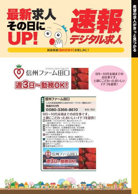 希望の求人がきっと見つかるデジタル求人速報最新求人その日にUP!新着情報【随時更新中】お楽しみに!週3日〜勤務OK!9月〜10月末頃までのお仕事です。土耕にこだわったおいしいイチゴを提供!☎080-3366-8610担当/田口9月〜10月末頃までのお仕事です。土耕にこだわったおいしいイチゴを提供!しなの鉄道滋野駅から徒歩10分!マイカー通勤もOK!時給950円信州ファーム田口東御市苗管理、ハウスの片付け、植え付けスタッフ(他仕事あります)※パート・アルバイト(3名)学歴・経験問いません、未経験者大歓迎!マイカー通勤OK、交通費規定支給、労災保険7:00〜12:00※朝のスタート時間相談OK!※出勤時間、勤務日数ご相談ください!9月〜10月末頃まで※仕事の状況で変動あり、週3日〜勤務OK!「ココどう?を見ました」と、お気軽にお電話ください。豊かな土壌と豊富な水でおいしいイチゴを育てましょう!信州ファーム田口東御市滋野乙147-2週3日〜勤務OK!https://www.shinshu-farm.jp/