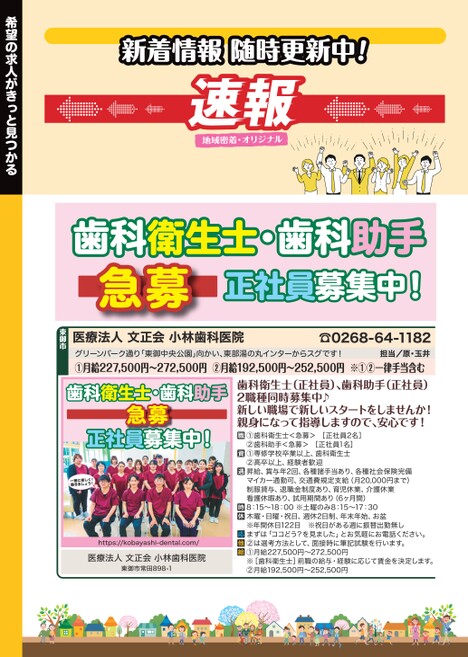 新着情報随時更新中!歯科衛生士・歯科助手正社員募集中!急募医療法人文正会小林歯科医院☎0268-64-1182グリーンパーク通り「東御中央公園」向かい、東部湯の丸インターからスグです!①月給227,500円〜272,500円②月給192,500円〜252,500円※①②一律手当含む担当/原・玉井希望の求人がきっと見つかる東御市歯科衛生士・歯科助手急募正社員募集中!一緒に楽しく!働きましょう!https://kobayashi-dental.com/医療法人文正会小林歯科医院東御市常田898-1歯科衛生士(正社員)、歯科助手(正社員)2職種同時募集中♪新しい職場で新しいスタートをしませんか!親身になって指導しますので、安心です!①歯科衛生士<急募>[正社員2名]②歯科助手<急募>[正社員1名]①専修学校卒業以上、歯科衛生士②高卒以上、経験者歓迎昇給、賞与年2回、各種諸手当あり、各種社会保険完備マイカー通勤可、交通費規定支給(月20,000円まで)制服貸与、退職金制度あり、育児休業、介護休業看護休暇あり、試用期間あり(6ヶ月間)8:15〜18:00※土曜のみ8:15〜17:30木曜・日曜・祝日、週休2日制、年末年始、お盆※年間休日122日※祝日がある週に振替出勤無しまずは「ココどう?を見ました」とお気軽にお電話ください。②は選考方法として、面接時に筆記試験を行います。①月給227,500円〜272,500円※[歯科衛生士]前職の給与・経験に応じて賃金を決定します。②月給192,500円〜252,500円