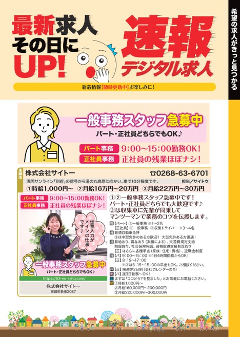 希望の求人がきっと見つかるデジタル求人速報最新求人その日にUP!新着情報【随時更新中】お楽しみに!一般事務スタッフ急募中パート・正社員どちらでもOK♪パート事務正社員事務9:00〜15:00勤務OK!正社員の残業ほぼナシ!浅間サンライン「別府」の信号から湯の丸高原に向かい、車で10分程度です。①時給1,000円〜②月給16万円〜20万円③月給22万円〜30万円担当/サイトウ☎0268-63-6701株式会社サイトー東御市①②一般事務スタッフ急募中です!パート・正社員どちらでも大歓迎です♪③は収集車に先輩が同乗してマンツーマンで業務のコツを伝授します。【パート】①一般事務※1〜2名【正社員】②一般事務③収集ドライバー※3〜4名普通自動車免許③は中型免許のある方歓迎!大型免許ある方優遇!昇給あり、賞与あり(実績による)、交通費規定支給制服貸与、社会保険完備、資格取得支援制度あり【正】はさらに各種手当(家族・住宅・資格)、退職金制度【パ】9:00〜15:00※1日4時間勤務からOK!【正】8:15〜17:00※③は6:15〜15:00の早出もOK。ご相談ください。【正】隔週休2日制(会社カレンダーあり)【パ】週3日勤務〜OK!まずは「ココどう?を見ました」とお気軽にお電話ください。①時給1,000円〜②月給160,000円〜200,000円③月給220,000円〜300,000円伝票入力がメインの仕事です♪一般事務スタッフ急募中パート・正社員どちらでもOK♪https://53-no-saito.com/株式会社サイトー東御市新張2087パート事務正社員事務9:00〜15:00勤務OK!正社員の残業ほぼナシ!
