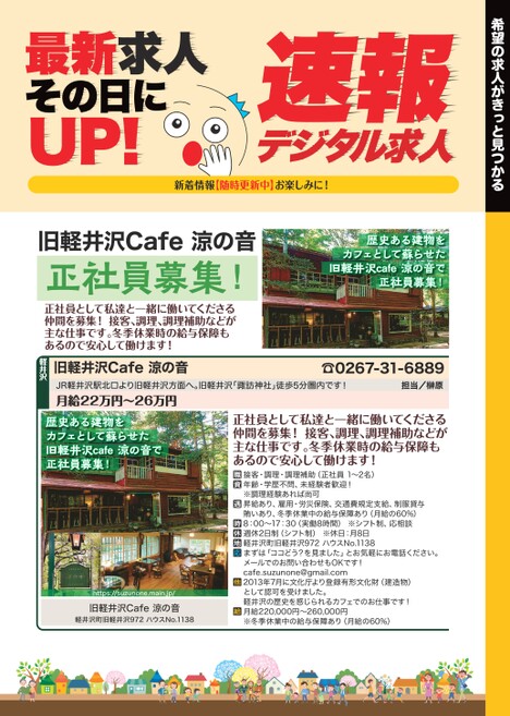 希望の求人がきっと見つかるデジタル求人速報最新求人その日にUP!新着情報【随時更新中】お楽しみに!旧軽井沢Cafe涼の音正社員募集!正社員として私達と一緒に働いてくださる仲間を募集!接客、調理、調理補助などが主な仕事です。冬季休業時の給与保障もあるので安心して働けます!歴史ある建物をカフェとして蘇らせた旧軽井沢cafe涼の音で正社員募集!☎0267-31-6889担当/原JR軽井沢駅北口より旧軽井沢方面へ。旧軽井沢「諏訪神社」徒歩5分圏内です!月給22万円〜26万円旧軽井沢Cafe涼の音軽井沢歴史ある建物をカフェとして蘇らせた旧軽井沢cafe涼の音で正社員募集!https://suzunone.main.jp/旧軽井沢Cafe涼の音軽井沢町旧軽井沢972ハウスNo.1138正社員として私達と一緒に働いてくださる仲間を募集!接客、調理、調理補助などが主な仕事です。冬季休業時の給与保障もあるので安心して働けます!接客・調理・調理補助(正社員1〜2名)年齢・学歴不問、未経験者歓迎!※調理経験あれば尚可昇給あり、雇用・労災保険、交通費規定支給、制服貸与賄いあり、冬季休業中の給与保障あり(月給の60%)8:00〜17:30(実働8時間)※シフト制、応相談週休2日制(シフト制)※休日:月8日軽井沢町旧軽井沢972ハウスNo.1138まずは「ココどう?を見ました」とお気軽にお電話ください。メールでのお問い合わせもOKです!cafe.suzunone@gmail.com2013年7月に文化庁より登録有形文化財(建造物)として認可を受けました。軽井沢の歴史を感じられるカフェでのお仕事です!月給220,000円〜260,000円※冬季休業中の給与保障あり(月給の60%)