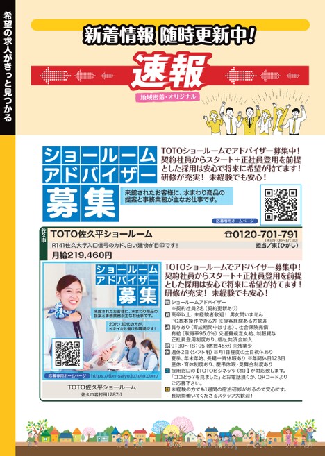 ショールームアドバイザーTOTOショールームでアドバイザー募集中!契約社員からスタート+正社員登用を前提とした採用は安心で将来に希望が持てます!研修が充実!未経験でも安心!応募専用ホームページ☎0120-701-791(平日9:00〜17:30)担当/東(ひがし)募集来館されたお客様に、水まわり商品の提案と事務業務が主なお仕事です。R141佐久大学入口信号のカド、白い建物が目印です!月給219,460円TOTO佐久平ショールーム佐久市ショールームアドバイザー募集来館されたお客様に、水まわり商品の提案と事務業務が主なお仕事です。20代・30代の方が、イキイキと働ける職場です!応募専用ホームページhttps://tbn-saiyo.jp.toto.com/TOTO佐久平ショールーム佐久市岩村田1787-1TOTOショールームでアドバイザー募集中!契約社員からスタート+正社員登用を前提とした採用は安心で将来に希望が持てます!研修が充実!未経験でも安心!ショールームアドバイザー※契約社員2名(契約更新あり)高卒以上、未経験者歓迎!男女問いませんPC基本操作できる方※接客経験ある方歓迎賞与あり(育成期間中は寸志)、社会保険完備有給(取得率95.6%)交通費規定支給、制服貸与正社員登用制度あり、福祉共済会加入9:30〜18:05(休憩45分)※残業少週休2日(シフト制)※月1日程度の土日祝休あり夏季、年末年始、長期一斉休暇あり※年間休日123日産休・育休制度あり、慶弔休暇・見舞金制度あり採用窓口の【TOTOビジネッツ(株)】が対応致します。「ココどう?を見ました」とお電話頂くか、QRコードよりご応募下さい。未経験の方でも1週間の宿泊研修があるので安心です。長期間働いてくださるスタッフ大歓迎!新着情報随時更新中!希望の求人がきっと見つかる
