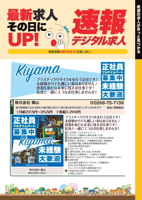 希望の求人がきっと見つかるデジタル求人速報新着情報【随時更新中】お楽しみに!最新求人その日にUP!フルタイムパート正社員募集中未経験大歓迎☎0268-75-7139担当/採用担当プラスチックリサイクルを行う会社です!未経験からでも難しい事はありません♪資源を新たな未来に残すお仕事です!私達と一緒にエコなお仕事しませんか!正社員募集中フルタイムパート未経験大歓迎https://kiyama-no1.jp/株式会社輝山東御市滋野乙3288-1プラスチックリサイクルを行う会社です!未経験からでも難しい事はありません♪資源を新たな未来に残すお仕事です!私達と一緒にエコなお仕事しませんか!①正社員②フルタイムパートプラスチック樹脂の工場内作業※2名普通自動車免許※フォークリフト免許あれば尚可昇給あり、賞与あり、交通費規定支給、制服貸与社会保険完備、各種免許取得補助制度あり①正社員は家族手当あり8:20〜17:40①週休2日制、GW、お盆、年末年始②週3日から勤務OK!※週5日も大歓迎!まずは「ココどう?を見ました」とお気軽にお電話ください。【仕事内容】主な仕事は収集されたプラスチック樹脂等の分別と加工作業を行います。フォークリフト免許も取得可能です♪①月給220,000円〜250,000円②時給1,200円道の駅雷電くるみの里を小諸方面に向かい「原口東」信号を右折してすぐの右手です①月給22万円〜25万円②時給1,200円株式会社輝山東御市
