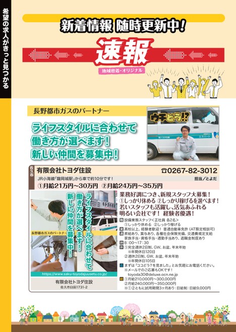 ☎0267-82-3012担当/とよだJR小海線「龍岡城駅」から車で約10分です!①月給21万円〜30万円②月給24万円〜35万円有限会社トヨダ住設佐久市業務好調につき、新規スタッフ大募集!①しっかり休める②しっかり稼げるを選べます!若いスタッフも活躍し、活気あふれる明るい会社です!経験者優遇!設備業務スタッフ<正社員各2名>①しっかり休める②しっかり稼げる高校以上、経験者歓迎!普通自動車免許(AT限定相談可)昇給あり、賞与あり、各種社会保険完備、交通費規定支給家族手当・資格手当・通勤手当あり、退職金制度あり8:00〜17:30①完全週休2日制、GW、お盆、年末年始※年間休日120日②週休2日制、GW、お盆、年末年始※年間休日105日まずは「ココどう?を見ました」とお気軽にお電話ください。※メールでのご応募もOKです!toyoda30@deluxe.ocn.ne.jp①月給210,000円〜300,000円②月給240,000円〜350,000円※①②ともに試用期間3ヶ月あり:日給制:日給9,000円ライフスタイルに合わせて働き方が選べます!新しい仲間を募集中!長野都市ガスのパートナーhttps://www.saku-toyodajuusetu.co.jp/有限会社トヨダ住設佐久市臼田1731-2新着情報随時更新中!希望の求人がきっと見つかる長野都市ガスのパートナーライフスタイルに合わせて働き方が選べます!新しい仲間を募集中!