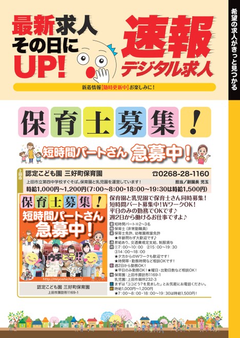 希望の求人がきっと見つかるデジタル求人速報最新求人その日にUP!保育士募集!新着情報【随時更新中】お楽しみに!短時間パートさん急募中!認定こども園三好町保育園上田市☎0268-28-1160担当/副園長児玉上田市立第四中学校すぐそば。保育園と乳児園を運営しています!時給1,000円〜1,200円(7:00〜8:00・18:00〜19:30は時給1,500円)保育園と乳児園で保育士さん同時募集!短時間パート募集中!WワークOK!平日のみの勤務でOKです♪週2日から働けるお仕事ですよ♪保育士募集!短時間パートさん急募中!短時間パート※2〜3名保育士(非常勤職員)保育士免許、幼稚園教諭免許★年齢問わず大歓迎です♪昇給あり、交通費規定支給、制服貸与①7:00〜10:00②15:00〜19:30③14:00〜18:00★夕方からのWワークも歓迎です!★時間帯・勤務時間など相談OKです!週2日から勤務OK!★平日のみ勤務OK!★曜日・出勤日数など相談OK!保育園:上田市諏訪形1169-1乳児園:上田市御所232-3まずは「ココどう?を見ました」とお気軽にお電話ください。時給1,000円〜1,200円★7:00〜8:00・18:00〜19:30は時給1,500円!http://miyoshicho.com/認定こども園三好町保育園上田市諏訪形1169-1