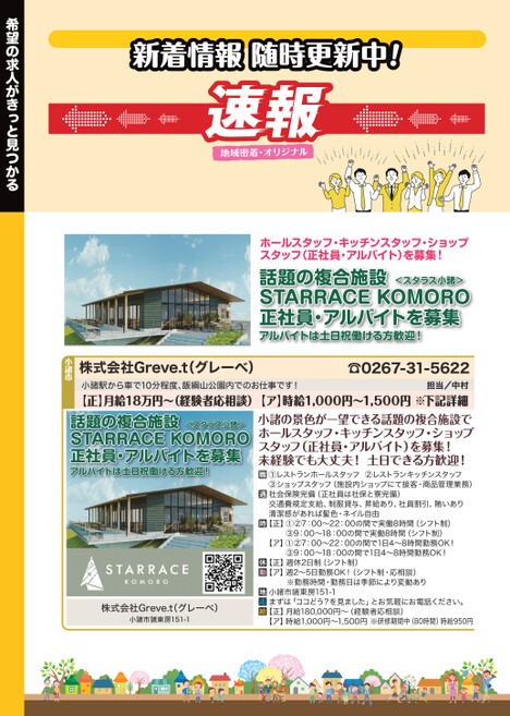 話題の複合施設STARRACEKOMORO正社員・アルバイトを募集<スタラス小諸>アルバイトは土日祝働ける方歓迎!ホールスタッフ・キッチンスタッフ・ショップスタッフ(正社員・アルバイト)を募集!新着情報随時更新中!希望の求人がきっと見つかる小諸駅から車で10分程度、飯綱山公園内でのお仕事です!担当/中村【正】月給18万円〜(経験者応相談)【ア】時給1,000円〜1,500円※下記詳細話題の複合施設小諸の景色が一望できる話題の複合施設でホールスタッフ・キッチンスタッフ・ショップSTARRACEKOMOROスタッフ(正社員・アルバイト)を募集!正社員・アルバイトを募集未経験でも大丈夫!土日できる方歓迎!<スタラス小諸>☎0267-31-5622株式会社Greve.t(グレーベ)小諸市アルバイトは土日祝働ける方歓迎!株式会社Greve.t(グレーベ)小諸市諸東房151-1①レストランホールスタッフ②レストランキッチンスタッフ③ショップスタッフ(施設内ショップにて接客・商品管理業務)社会保険完備(正社員は社保と寮完備)交通費規定支給、制服貸与、昇給あり、社員割引、賄いあり清潔感があれば髪色・ネイル自由【正】①②7:00〜22:00の間で実働8時間(シフト制)③9:00〜18:00の間で実働8時間(シフト制)【ア】①②7:00〜22:00の間で1日4〜8時間勤務OK!③9:00〜18:00の間で1日4〜8時間勤務OK!【正】週休2日制(シフト制)【ア】週2〜5日勤務OK!(シフト制・応相談)※勤務時間・勤務日は季節により変動あり小諸市諸東房151-1まずは「ココどう?を見ました」とお気軽にお電話ください。【正】月給180,000円〜(経験者応相談)【ア】時給1,000円〜1,500円※研修期間中(80時間)時給950円