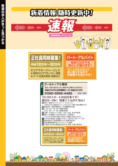 ☎090-5992-448510:00スタートのお仕事です!週3日〜OK!残業ナシなので安心!担当/落合西友小諸小原店内(JR小海線東小諸駅から徒歩8分)時給980円(試用期間3ヶ月:時給960円)ゴールドノア小諸店小諸市受付・事務スタッフ(パート・アルバイト)※持込された商品をマニュアルに沿って買い取る業務です!昇給あり、雇用保険あり、交通費規定支給①10:00〜18:00(実働7時間)②10:00〜17:00(実働6時間)日曜・その他(シフト制)、GW、お盆、年末年始等週3〜5日勤務※平日のみOK!(応相談)☆子どもの学校行事や予定など柔軟に対応します☆まずはお気軽にお電話ください。受付10:00〜17:00時給980円(試用期間3ヶ月:時給960円)貴金属買取専門店ゴールドノア小諸店小諸市大字甲字東原田1649-6西友小諸小原店内正社員同時募集!18万円〜30万円月給エリアマネージャーとして★地域のエリアマネージャー業務★パート社員の教育・指導などパート・アルバイト初めての方でも安心して働けます!マニュアルに沿って買い取りするので未経験でも安心です!貴金属買取専門店古物商番号第481101700035号正社員同時募集!18万円〜30万円月給エリアマネージャーとして★地域のエリアマネージャー業務★パート社員の教育・指導などパート・アルバイト初めての方でも安心して働けます!マニュアルに沿って買い取りするので未経験でも安心です!新着情報随時更新中!希望の求人がきっと見つかる