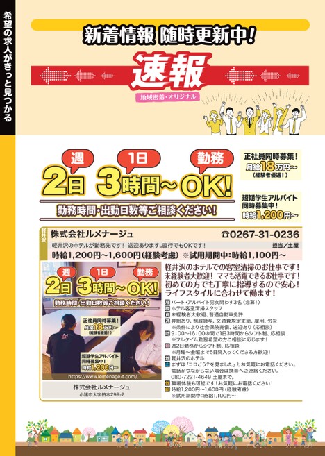 2週日31日時間〜勤務OK!勤務時間・出勤日数等ご相談ください!正社員同時募集!18万円〜月給(経験者優遇!)短期学生アルバイト同時募集中!時給1,200円〜新着情報随時更新中!希望の求人がきっと見つかる軽井沢のホテルが勤務先です!送迎あります。直行でもOKです!時給1,200円〜1,600円(経験考慮)※試用期間中:時給1,100円〜担当/土屋2週日31日時間〜勤務OK!勤務時間・出勤日数等ご相談ください!正社員同時募集!18万円〜月給(経験者優遇!)短期学生アルバイト同時募集中!1,200円〜時給https://www.lemenage-t.com/株式会社ルメナージュ小諸市大字柏木299-2軽井沢のホテルでの客室清掃のお仕事です!未経験者大歓迎!ママも活躍できるお仕事です!初めての方でも丁寧に指導するので安心!ライフスタイルに合わせて働ます!パート・アルバイト男女問わず3名(急募!)ホテル客室清掃スタッフ未経験者大歓迎、普通自動車免許昇給あり、制服貸与、交通費規定支給、雇用、労災※条件により社会保険完備、送迎あり(応相談)9:00〜16:00の間で1日3時間からシフト制、応相談※フルタイム勤務希望の方ご相談に応じます!週2日勤務からシフト制、応相談※月曜〜金曜まで5日間入ってくださる方歓迎!軽井沢のホテルまずは「ココどう?を見ました」とお気軽にお電話ください。電話がつながらない場合は携帯へご連絡ください。080-7221-4649土屋まで。職場体験も可能です!お気軽にお電話ください!時給1,200円〜1,600円(経験考慮)※試用期間中:時給1,100円〜☎0267-31-0236株式会社ルメナージュ軽井沢