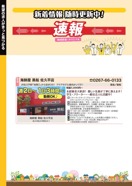 海鮮屋黒船佐久平店☎0267-66-0133担当/岩松JR佐久平駅「浅間口」から徒歩3分!アクアホテル様向かいです!時給1,000円〜未経験者大歓迎!優しい先輩が丁寧に教えます!学生・フリーター・一般社会人も活躍中!週2日〜1日3時間〜勤務OK♪①キッチンスタッフ(アルバイト2名)②ホールスタッフ(アルバイト1名)未経験者大歓迎!学生・一般社会人・主婦(夫)も歓迎!制服貸与、食事補助あり、交通費一部支給、昇給あり深夜手当あり(22:00以降)、社割りあり(ご家族もOK)社会保険完備、正社員登用制度あり17:00〜24:00の間で、1日3時間勤務からOK!(応相談)週2日勤務からOK!※シフト制応相談佐久市佐久平駅北まずは「ココどう?を見ました」とお気軽にお電話ください。時給1,000円〜※22:00以降:時給25%UP!※研修期間100時間:時給950円〜https://kurofune-nagano.jp/海鮮屋黒船佐久平店佐久市佐久平駅北3-1新着情報随時更新中!佐久市希望の求人がきっと見つかる