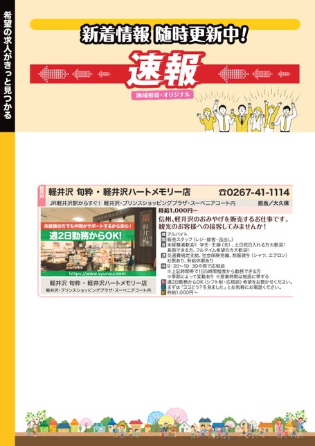 軽井沢旬粋・軽井沢ハートメモリー店JR軽井沢駅からすぐ!軽井沢・プリンスショッピングプラザ・スーベニアコート内☎0267-41-1114担当/大久保未経験の方でも仲間がサポートするから安心!週2日勤務からOK!https://www.syunsui.com軽井沢旬粋・軽井沢ハートメモリー店軽井沢・プリンスショッピングプラザ・スーベニアコート内時給1,000円〜信州、軽井沢のおみやげを販売するお仕事です。観光のお客様への接客してみませんか!アルバイト販売スタッフ(レジ・接客・品出し)未経験者歓迎!学生・主婦(夫)、土日祝日入れる方大歓迎!長期できる方、フルタイム希望の方大歓迎!交通費規定支給、社会保険完備、制服貸与(シャツ、エプロン)社割あり、有給休暇あり9:30〜19:30の間で応相談※上記時間帯で1日5時間程度から勤務できる方※季節によって変動あり※営業時間は施設に準ずる週2日勤務からOK(シフト制・応相談)希望をお聞かせください。まずは「ココどう?を見ました」とお気軽にお電話ください。時給1,000円〜新着情報随時更新中!軽井沢希望の求人がきっと見つかる