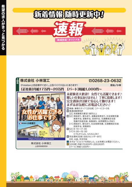 新着情報随時更新中!株式会社小林溶工D'station上田店様すぐ近く。上田バイパス沿いにあります![正社員]月給17万円〜20万円[パート]時給1,000円〜☎0268-23-0632担当/小林未経験者大歓迎!女性でも活躍できます♪難しい仕事はありません!丁寧に指導します!完全週休2日制で安心して働けます!まずはお気軽にお電話ください♪検査・事務スタッフ[正社員][パート]2〜3名普通自動車免許[正]未経験者大歓迎!高卒以上[正]昇給あり、賞与あり、退職金制度あり、社会保険完備家族手当、皆勤手当、技術手当、交通費規定支給残業代別途支給、制服貸与、試用期間3ヶ月あり[パ]昇給あり、賞与あり、社会保険完備、交通費規定支給技術手当、制服貸与[正]8:15〜17:00[パ]9:00〜15:00※フルタイムも、もちろんOK!完全週休2日制(会社カレンダーあり)GW、お盆、年末年始まずは「ココどう?を見ました」とお気軽にお電話ください。[正社員]月給170,000円〜200,000円[パート]時給1,000円〜女性が活躍できる女きお仕事です♪仕で詳しくはホームページも見てね!https://www.k-youkou.com/株式会社小林溶工上田市秋和959上田市希望の求人がきっと見つかる