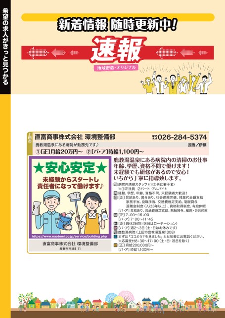 ☎026-284-5374担当/伊藤直富商事株式会社環境整備部鹿教湯温泉にある病院が勤務先です♪①[正]月給20万円〜②[パ・ア]時給1,100円〜上田市新着情報随時更新中!希望の求人がきっと見つかる★安心安定★未経験からスタートし責任者になって働けます♪https://www.naotomi.co.jp/service/building.php直富商事株式会社環境整備部長野市市場1-11鹿教湯温泉にある病院内の清掃のお仕事年齢、学歴、資格不問で働けます!未経験でも研修があるので安心!いちから丁寧に指導致します。病院内清掃スタッフ(①②共に若干名)※①正社員②パート・アルバイト経験、学歴、年齢、資格不問、未経験者大歓迎![正]昇給あり、賞与あり、社会保険完備、残業代全額支給家族手当、役職手当、交通費規定支給、制服貸与退職金制度(入社3年以上)、資格取得制度、有給休暇[パ・ア]昇給あり、交通費規定支給、制服貸与、雇用・労災保険[正]7:00〜16:00[パ・ア]7:00〜11:45[正]週休2日制(休日はローテーション)[パ・ア]週2〜3日(土・日はお休みです)鹿教湯病院(上田市鹿教湯温泉1308)まずは「ココどう?を見ました」とお気軽にお電話ください。※応募受付8:30〜17:00(土・日・祝日を除く)[正]月給200,000円〜[パ・ア]時給1,100円〜