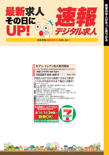 希望の求人がきっと見つかるデジタル求人速報最新求人その日にUP!新着情報【随時更新中】お楽しみに!セブン-イレブン佐久野沢西店R141「野沢西信号」を野沢北高校方面に曲がってスグです!時給1,000円+諸手当あり☎0267-64-4811担当/甘利早朝または夕方から勤務できる方大歓迎!ママさんや中高年の方まで幅広く活躍中!佐久市パート・アルバイトレジ・接客販売・店内清掃・商品陳列・品出し・発注など年齢不問、WワークOK!主婦(夫)の方からシニアの方活躍できます!制服貸与、昇給制度、有給休暇あり、マイカー通勤可①6:00〜12:00②12:00〜18:00③17:00〜22:00※1日3時間から応相談週1日勤務からOK!週5日勤務も応相談♪まずは「ココどう?を見ました」とお気軽にお電話ください。時給1,000円+諸手当ありセブン-イレブン佐久野沢西店佐久市野沢479-6発注業務がしっかりできる方発注手当が付きます♪週1日1日3時間〜勤務OK!セブン-イレブン佐久野沢西店