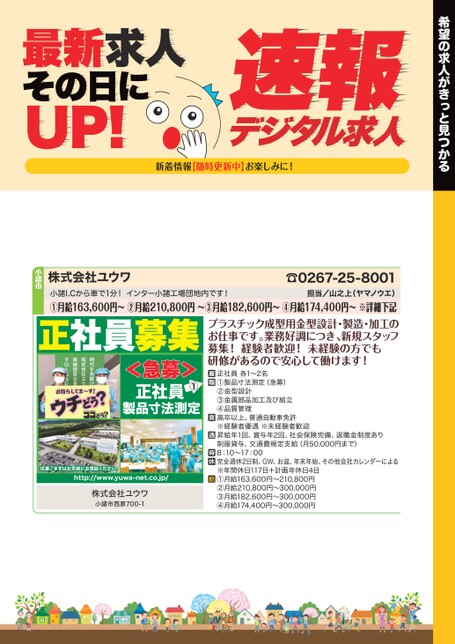 希望の求人がきっと見つかるデジタル求人速報新着情報【随時更新中】お楽しみに!最新求人その日にUP!<急募>①正社員製品寸法測定正社員各1〜2名①製品寸法測定(急募)②金型設計③金属部品加工及び組立④品質管理高卒以上、普通自動車免許※経験者優遇※未経験者歓迎昇給年1回、賞与年2回、社会保険完備、退職金制度あり制服貸与、交通費規定支給(月50,000円まで)8:10〜17:00完全週休2日制、GW、お盆、年末年始、その他会社カレンダーによる※年間休日117日+計画年休日4日①月給163,600円〜210,800円②月給210,800円〜300,000円③月給182,600円〜300,000円④月給174,400円〜300,000円☎0267-25-8001担当/山之上(ヤマノウエ)小諸I.Cから車で1分!インター小諸工場団地内です!①月給163,600円〜②月給210,800円〜③月給182,600円〜④月給174,400円〜※詳細下記プラスチック成型用金型設計・製造・加工のお仕事です。業務好調につき、新規スタッフ募集!経験者歓迎!未経験の方でも研修があるので安心して働けます!正社員募集株式会社ユウワ小諸市応募/まずはお気軽にお電話ください。http://www.yuwa-net.co.jp/株式会社ユウワ小諸市西原700-1