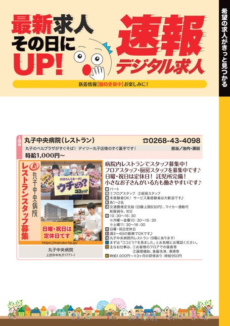 希望の求人がきっと見つかるデジタル求人速報最新求人その日にUP!新着情報【随時更新中】お楽しみに!☎0268-43-4098担当/池内・須田丸子中央病院(レストラン)丸子のベルプラザがすぐそば!デイツー丸子店様のすぐ裏手です!時給1,000円〜上田市病院内レストランでスタッフ募集中!フロアスタッフ・厨房スタッフを募集中です♪日曜・祝日は定休日!託児所完備!小さなお子さんがいる方も働きやすいです♪パート①フロアスタッフ②厨房スタッフ未経験者OK!サービス業経験者は大歓迎です♪各1〜2名交通費規定支給(日額上限830円)、マイカー通勤可制服貸与、労災10:30〜16:30※月曜〜金曜10:30〜16:30※土曜11:30〜16:00日曜・祝日定休日週3〜4日の勤務でOKです♪丸子中央病院内レストラン(9階にあります)まずは「ココどう?を見ました」とお気軽にお電話ください。主なお仕事は、①お客様のフロアでの接客等②調理補助、食器洗浄、清掃等時給1,000円〜※3ヶ月の研修あり:時給950円日曜・祝日は定休日ですhttps://maruko-hp.jp/丸子中央病院上田市中丸子1771-1レストランスタッフ募集