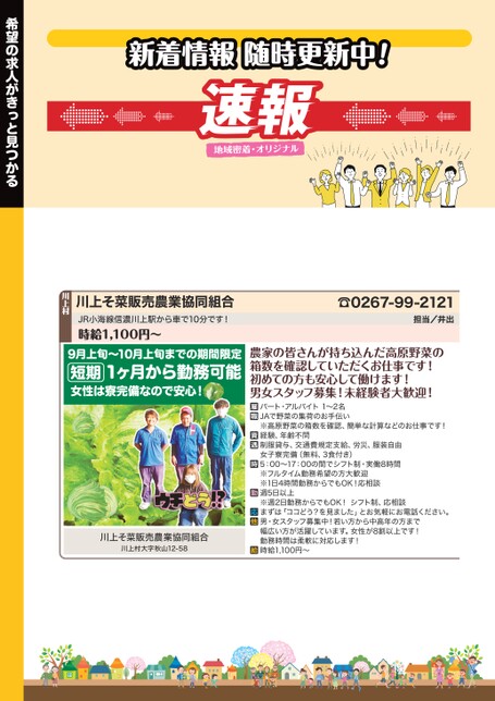 ☎0267-99-2121担当/井出農家の皆さんが持ち込んだ高原野菜の箱数を確認していただくお仕事です!初めての方も安心して働けます!男女スタッフ募集!未経験者大歓迎!パート・アルバイト1〜2名JAで野菜の集荷のお手伝い※高原野菜の箱数を確認、簡単な計算などのお仕事です!経験、年齢不問制服貸与、交通費規定支給、労災、服装自由女子寮完備(無料、3食付き)5:00〜17:00の間でシフト制・実働8時間※フルタイム勤務希望の方大歓迎※1日4時間勤務からでもOK!応相談週5日以上※週2日勤務からでもOK!シフト制、応相談まずは「ココどう?を見ました」とお気軽にお電話ください。男・女スタッフ募集中!若い方から中高年の方まで幅広い方が活躍しています。女性が8割以上です!勤務時間は柔軟に対応します!時給1,100円〜川上そ菜販売農業協同組合JR小海線信濃川上駅から車で10分です!時給1,100円〜川上村9月上旬〜10月上旬までの期間限定短期女性は寮完備なので安心!1ヶ月から勤務可能川上そ菜販売農業協同組合川上村大字秋山12-58新着情報随時更新中!希望の求人がきっと見つかる