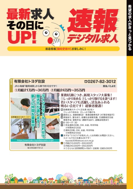 希望の求人がきっと見つかるデジタル求人速報最新求人その日にUP!新着情報【随時更新中】お楽しみに!☎0267-82-3012担当/とよだJR小海線「龍岡城駅」から車で約10分です!①月給21万円〜30万円②月給24万円〜35万円有限会社トヨダ住設佐久市業務好調につき、新規スタッフ大募集!①しっかり休める②しっかり稼げるを選べます!若いスタッフも活躍し、活気あふれる明るい会社です!経験者優遇!設備業務スタッフ<正社員各2名>①しっかり休める②しっかり稼げる高校以上、経験者歓迎!普通自動車免許(AT限定相談可)昇給あり、賞与あり、各種社会保険完備、交通費規定支給家族手当・資格手当・通勤手当あり、退職金制度あり8:00〜17:30①完全週休2日制、GW、お盆、年末年始※年間休日120日②週休2日制、GW、お盆、年末年始※年間休日105日まずは「ココどう?を見ました」とお気軽にお電話ください。※メールでのご応募もOKです!toyoda30@deluxe.ocn.ne.jp①月給210,000円〜300,000円②月給240,000円〜350,000円※①②ともに試用期間3ヶ月あり:日給制:日給9,000円ライフスタイルに合わせて働き方が選べます!新しい仲間を募集中!長野都市ガスのパートナーhttps://www.saku-toyodajuusetu.co.jp/有限会社トヨダ住設佐久市臼田1731-2