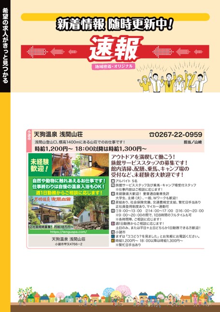 ☎0267-22-0959担当/山崎天狗温泉浅間山荘浅間山登山口、標高1400mにある山荘でのお仕事です!時給1,200円〜18:00以降は時給1,300円〜小諸市新着情報随時更新中!希望の求人がきっと見つかる未経験歓迎!自然や動物に触れあえるお仕事です!仕事終わりは自慢の温泉入浴もOK!週1日勤務からご相談に応じます!正社員同時募集!月給18万円〜https://tenguspa.com/天狗温泉浅間山荘小諸市甲又4766-2アウトドアを満喫して働こう!旅館サービススタッフの募集です!館内清掃、配膳、乗馬、キャンプ場の受付など、未経験者大歓迎です!アルバイト5名旅館サービススタッフ及び乗馬・キャンプ場受付スタッフ※仕事内容はご相談に応じます!未経験者大歓迎!要普通自動車免許大学生、主婦(夫)、一般、Wワークも歓迎!昇給あり、社会保険完備、交通費規定支給、繁忙日手当あり正社員登用制度あり、マイカー通勤可①9:00〜13:00②14:00〜17:00③16:00〜20:00※9:00〜20:00の間で、1日8時間のフルタイムも可※各時間帯、ご相談に応じます!週1日勤務からご相談に応じます!土日のみ、または平日+土日どちらか1日勤務できる方歓迎!小諸市まずは「ココどう?を見ました」とお気軽にお電話ください。時給1,200円〜18:00以降は時給1,300円〜※繁忙日手当あり