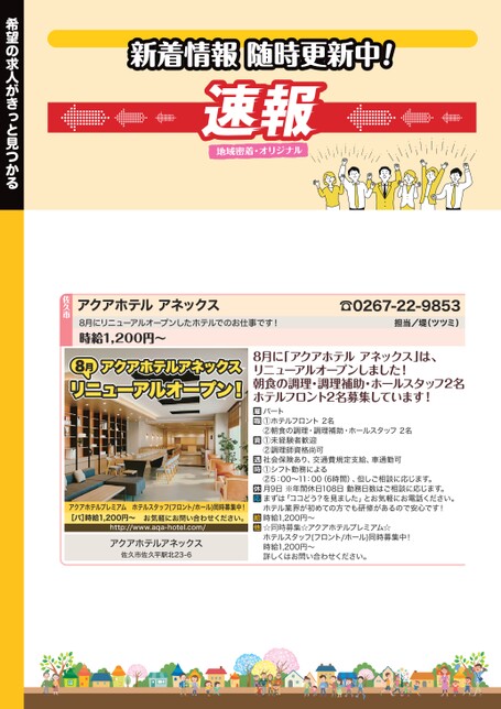 ☎0267-22-9853担当/堤(ツツミ)アクアホテルアネックス8月にリニューアルオープンしたホテルでのお仕事です!時給1,200円〜佐久市新着情報随時更新中!希望の求人がきっと見つかる8月アクアホテルアネックスリニューアルオープン!アクアホテルプレミアムホテルスタッフ(フロント/ホール)同時募集中![パ]時給1,200円〜お気軽にお問い合わせください。http://www.aqa-hotel.com/アクアホテルアネックス佐久市佐久平駅北23-68月に「アクアホテルアネックス」は、リニューアルオープンしました!朝食の調理・調理補助・ホールスタッフ2名ホテルフロント2名募集しています!パート①ホテルフロント2名②朝食の調理・調理補助・ホールスタッフ2名①未経験者歓迎②調理師資格尚可社会保険あり、交通費規定支給、車通勤可①シフト勤務による②5:00〜11:00(6時間)、但しご相談に応じます。月9日※年間休日108日勤務日数はご相談に応じます。まずは「ココどう?を見ました」とお気軽にお電話ください。ホテル業界が初めての方でも研修があるので安心です!時給1,200円〜☆同時募集☆アクアホテルプレミアム☆ホテルスタッフ(フロント/ホール)同時募集中!時給1,200円〜詳しくはお問い合わせください。